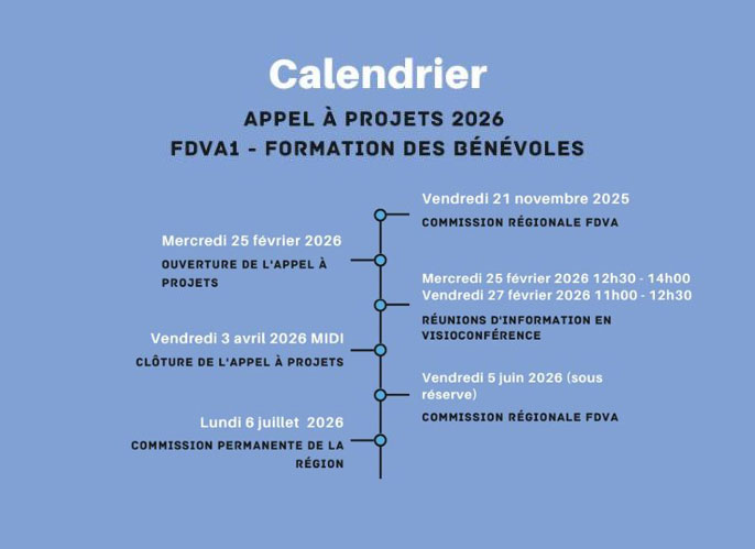 Le Mercredi 25 février, ouverture de l'appel à projets du FDVA (Fonds de Développement de la Vie Associative) dédié à la formation des bénévoles. Retrouvez ici le calendrier le la campagne 2026