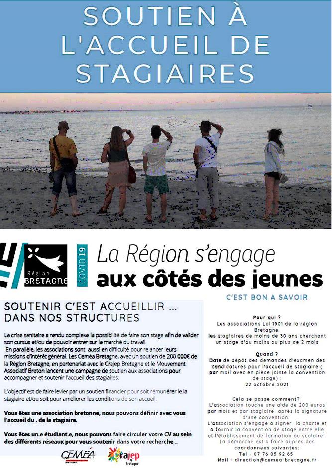 Afin de soutenir les jeunes et l'action associative, la Région Bretagne soutien l'acceuil de stagiaires de moins de 30 ans par l'octroi d'une aide de 200 €/ mois. Ce soutien financier peut servir à rémunérer le.la stagiaire et/ou améliroer les conditions de son accueil au sein de l'association.